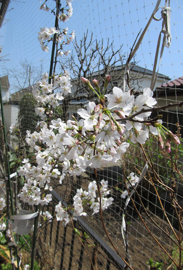 今年も開花の時期が近くなってまいりました。 うちの『染井吉野』姫の蕾もだいぶ大きくなってきましたが、 まだ、先が桃色にはなっておりませんので、 咲くのはもう少し先ですね。 お迎えした次の年2010年は開花が遅く、 そしていつまでも寒かったのを覚えてます。 雪が降って、せっかく開いた花の上に積もってました。 その時の様子を、主人がビデオで撮っておりました。 写真は主人が撮った上の一枚だけです。 雪が溶けて、水滴になっているのがおわかりいただけるでしょうか。 2011年は、花数が少なかったです。 この時期はまだ根っこが、 植木鉢の中にきちんとおさまっておりましたので、 栄養も行き届いてなかったからだと思います。 その頃は、沢山咲くときと、 あまり咲かないときが一年おきでしたね。 桜には本当に虫がつきます。 薔薇もすごいですが、桜も同じ位すごいです。 綺麗な花には虫がつきやすいのはしょうがないというところですか(^_^; 今までは見つけたら、『ベニカ』などで殺虫しておりましたが、 ここ何年かは真面目に、2週に1度、 大潮(満月と新月のとき)の前後に薬を撒いております。 大潮の時に、虫が多数産卵するそうで、 その前後を狙うといいと指導書にありましたので、 それに従ってやってます。 本当は桜のためではなく、薔薇のために始めたのですが、 やるときは、庭の姫達全てに撒いております。 ちゃんと、殺菌・殺虫の5種類の薬でローテーションを組んでます。 そうじゃないとすぐに耐性ができて、薬品が効かなくなるそうです。 まぁ、人間への薬、抗生物質とか睡眠剤とか、を考えると、 納得できますねぇ。 殺菌・殺虫剤を撒かない週は、ダニ剤を撒きます。 ハンドスプレーで撒くと、手が死にそうになるので、 4リットルの蓄圧式噴霧器を使ってます。 こりゃー楽ちん~♪ もう何年も前になりますが、 お隣の庭(といってもかなり広い)に スナックエンドウが沢山植わっていたのですが、 もう終わりだと、急に全部抜いてしまって綺麗になったせいか、 うちの庭に青虫が大量発生し、 姫達の新芽や蕾を食い荒らしてくれましたヽ(`⌒´)ノ ウッキー ので、即、薬を散布致しました。 それでも全滅というわけではなかったので、 次の週に、違う薬を散布致しました。 参考にさせていただいている指導書は 高原通寿先生の 『根力で咲かせる バラつくり』 です。 2012年は去年のちょっとはなんだったんだろう? というくらい花が咲きました。 他の桜姫達が御隠れになってしまった次の年は 本当に花が少なかったです。 『染井吉野』姫は根っこが大きかった故に、 なんとか生き延びただけであって、 枯れはしなかったものの、かなりのダメージがあったようです。 花が少ないのは、そういうことだったと思います。 花がつかなくても不思議ではなかったのに、 何輪かでも咲かせてくれたので、ほっとしました。 最後に、東山魁夷先生の『花明かり』を思い浮かべながら 撮った写真で締めくくりたいと思います。 ☆参考文献☆ 高原通寿先生著『根力で咲かせる バラつくり』 『ニコニコ動画』で自作の紙芝居風動画公開してます。 アカウントをお持ちの方で、 興味をお持ちくださった方は よろしかったらどうぞご覧ください。 『桜日和~ほとりにて』 PR